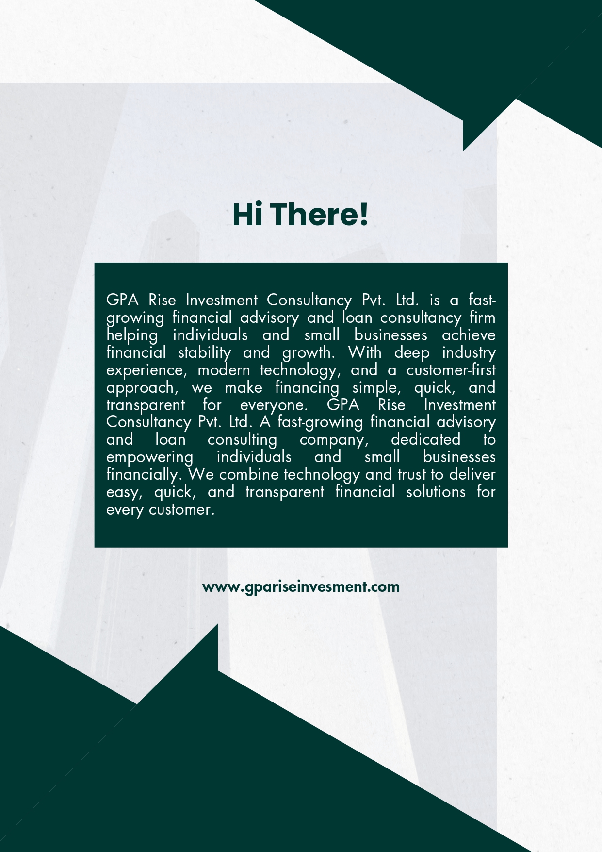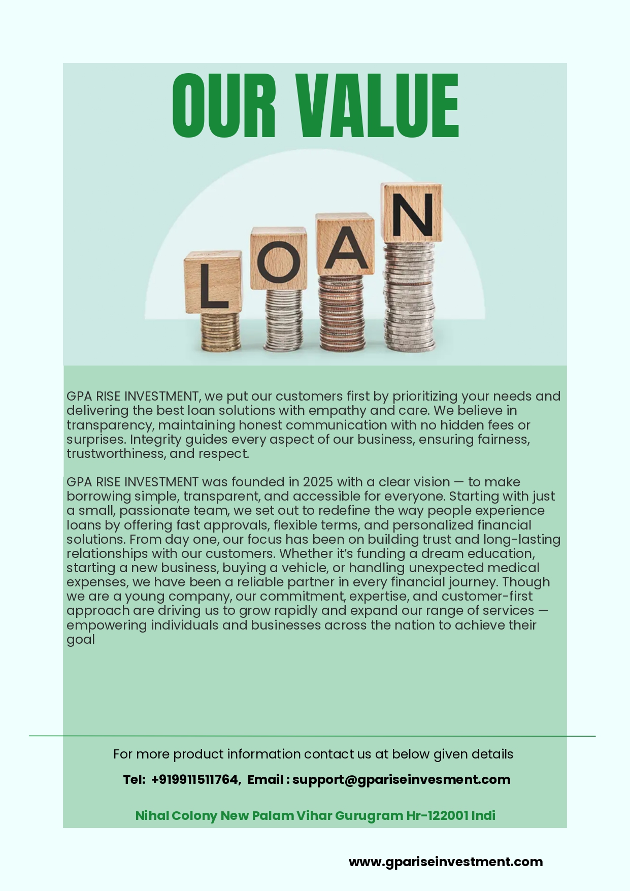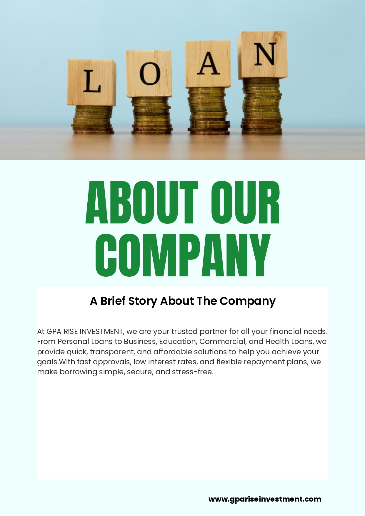 Our brochure is designed to grab your attention instantly and keep you engaged long enough to discover how GPA RISE INVESTMENT can provide the perfect loan solution for your needs.
