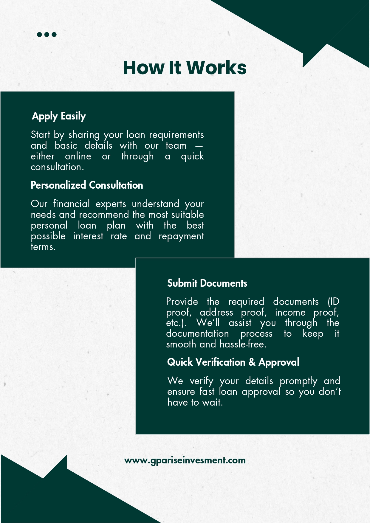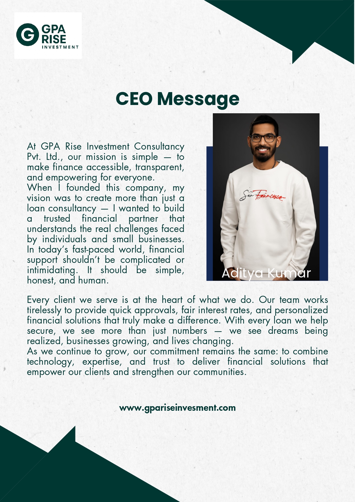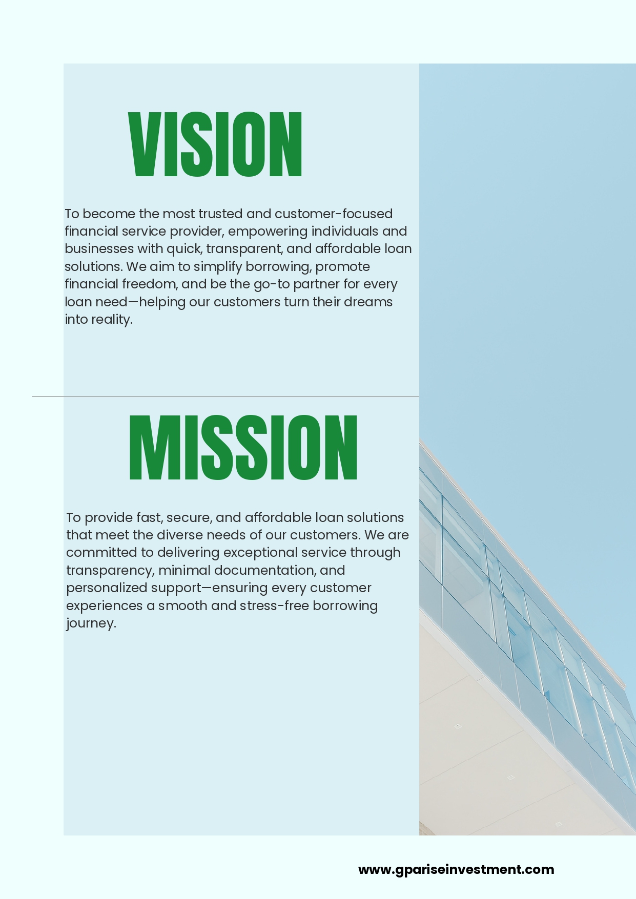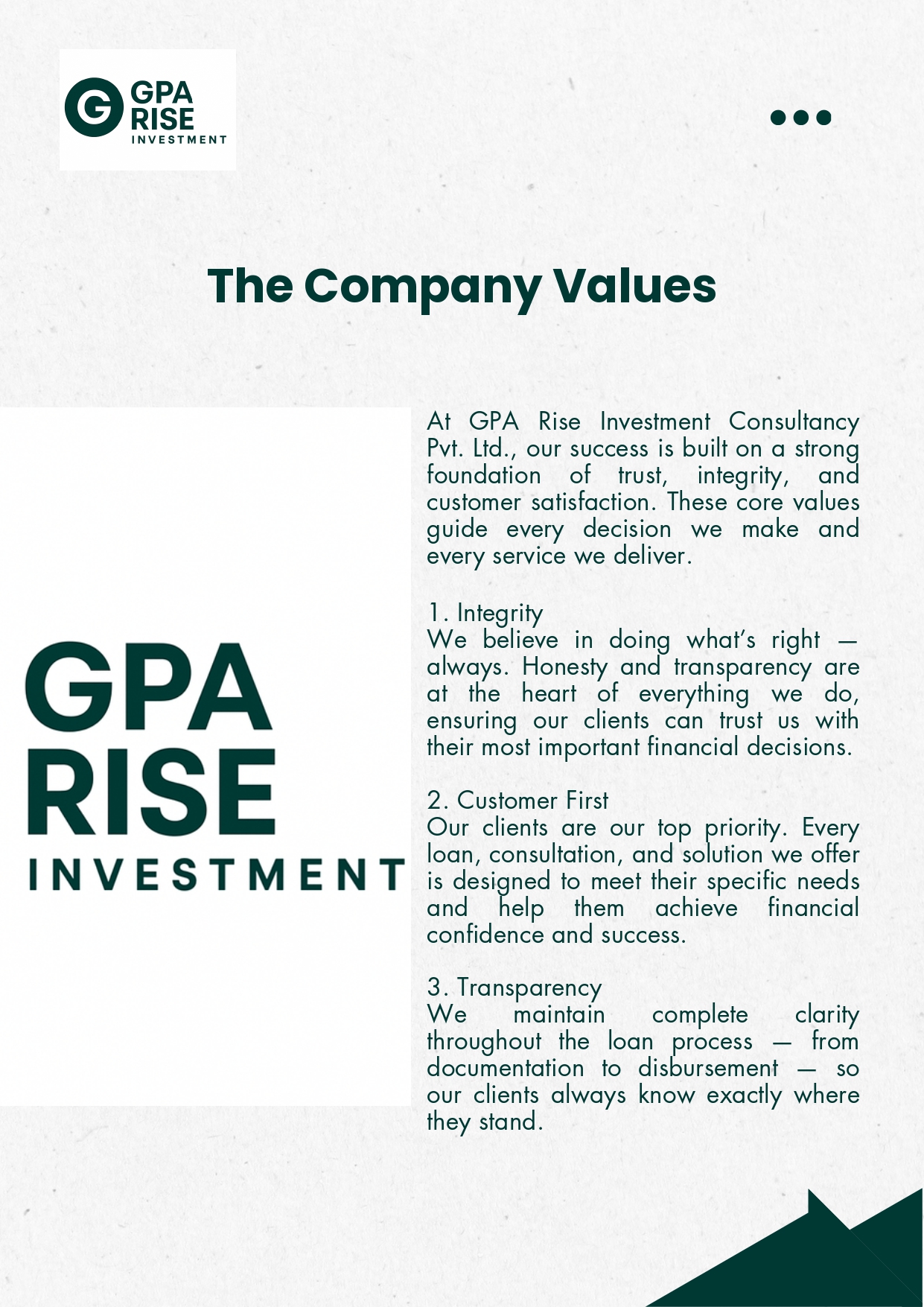 Our brochure is designed to grab your attention instantly and keep you engaged long enough to discover how GPA RISE INVESTMENT can provide the perfect loan solution for your needs.