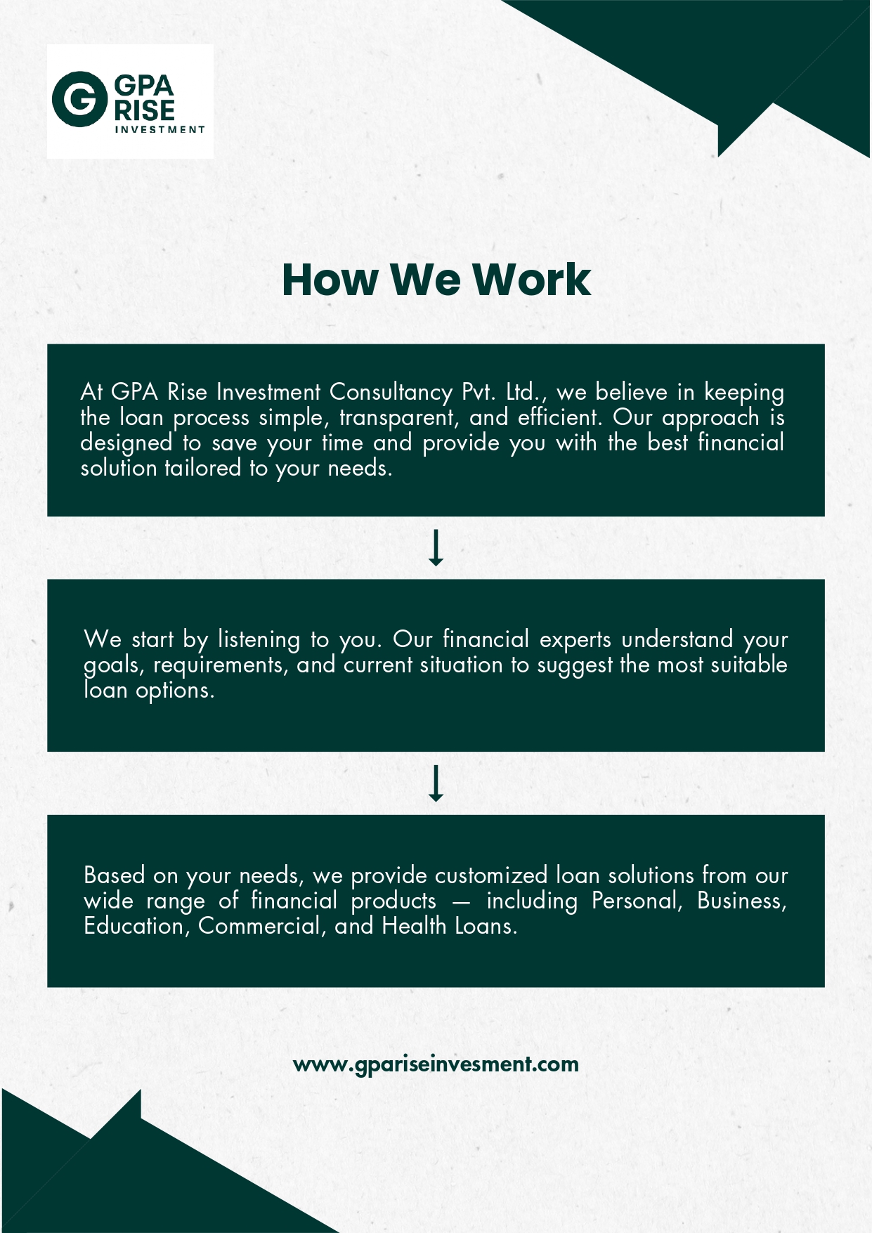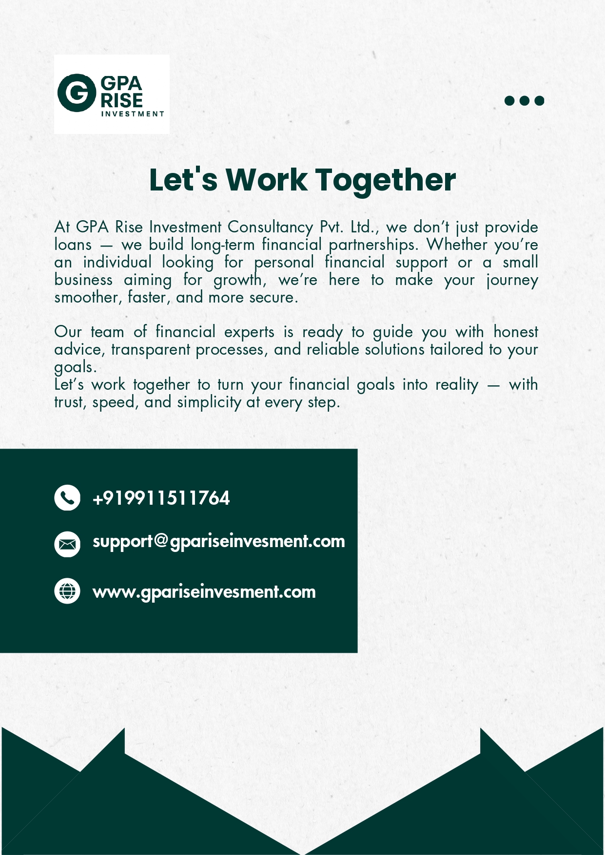 GPA RISE INVESTMENT doesn’t hand over your financial needs to just anyone—we take personal responsibility in guiding you with the right loan solutions. From quick approvals to transparent processes, we are committed to helping you achieve your goals every step of the way.