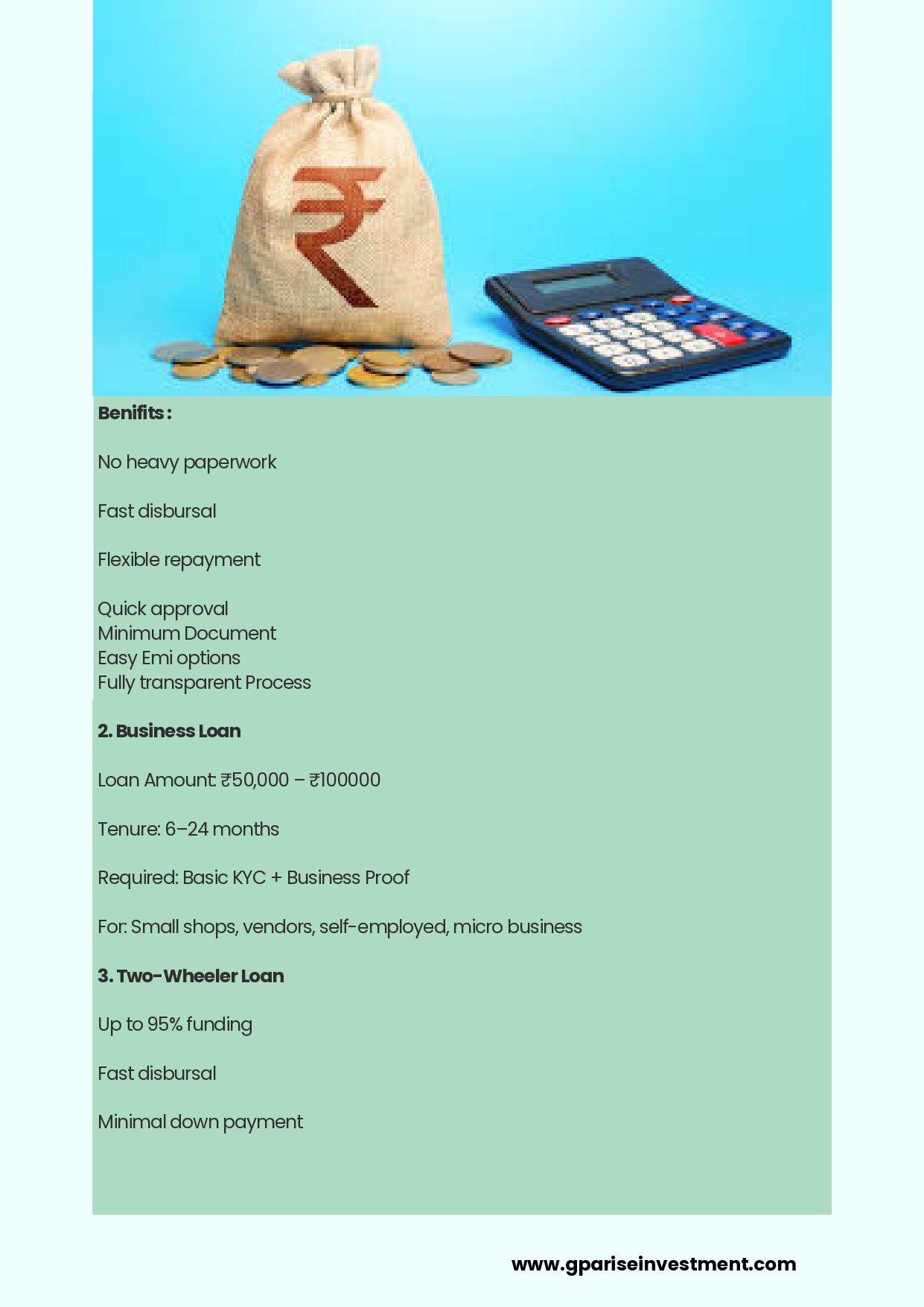 Find Out MoreGrow your business with GPA RISE INVESTMENT Business Loan to expand, buy tools, or start projects.